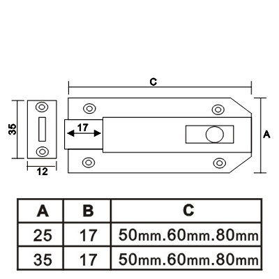 O parafuso de lavagem montado em superfície é feito de aço inoxidável de alta resistência com uma superfície finamente polida e tratada com anticorrosão, resultando em uma aparência elegante e elegante. Seu design simples permite uma aparência suave e elegante. O parafuso está disponível em larguras de 25mm e 35mm, com comprimentos (C) de 50mm, 60mm e 80mm, atendendo a vários requisitos de instalação. A posição B é de 17mm, e o espaço óptimo do furo de montagem permite uma fixação rápida e fácil à superfície da porta.